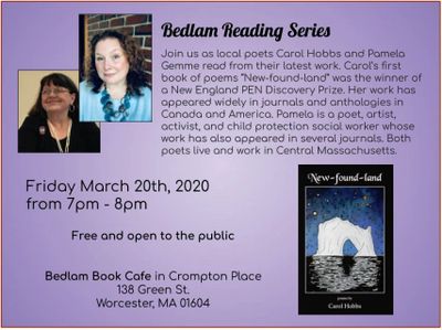 Join us as local poets Carol Hobbs and Pamela Gemme read their latest work. Carol's first book of poems New-found-land was the winner of a New England PEN Discovery Prize. Her work has appeared widely in journals and anthologies in Canada and America. Pamela is a poet, artist, activist, and child protection social worker whose work has also appeared in several journals. Both poets live and work in Central Massachusetts.